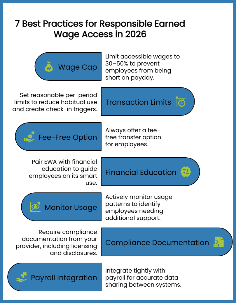 Q: What percentage of earned wages can employees access early? A: Best practice is to cap early access at 30–50% of earned wages per pay period. This protects employees from shortfalling on actual payday and reduces habitual advance patterns that can deepen financial instability.