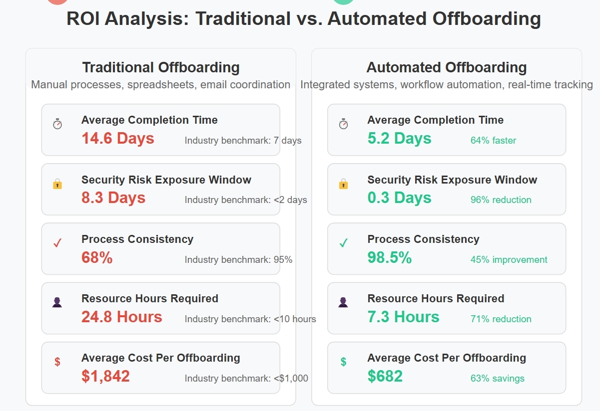 This side-by-side visual compares key performance metrics between traditional and automated offboarding approaches. The stark contrast in completion time, security exposure, process consistency, resource requirements, and cost clearly demonstrates the ROI of implementing an automated system.
