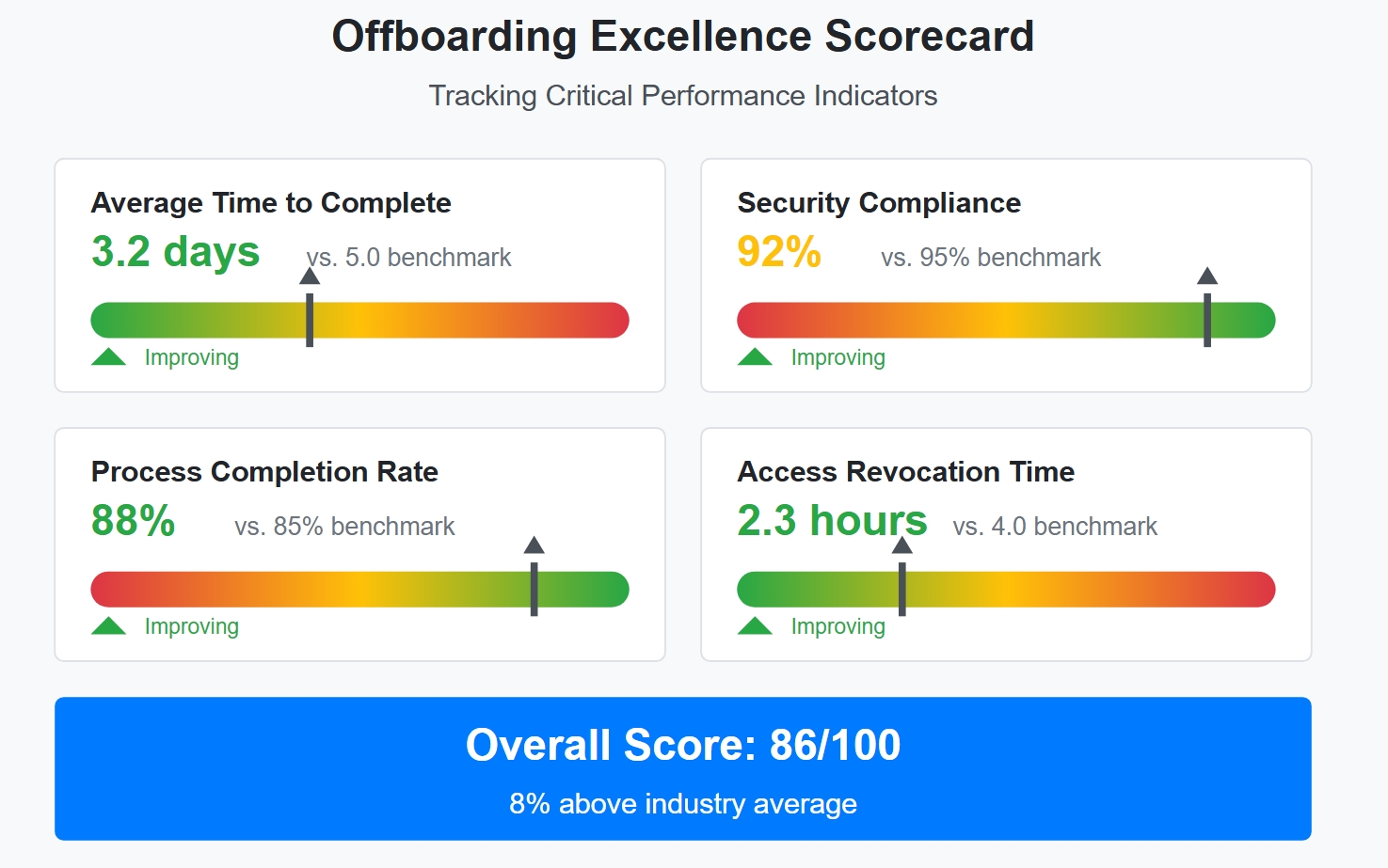 Establish baseline measurements before implementing process improvements, then track progress quarterly. Share results with leadership to demonstrate the business impact of your offboarding excellence initiatives.