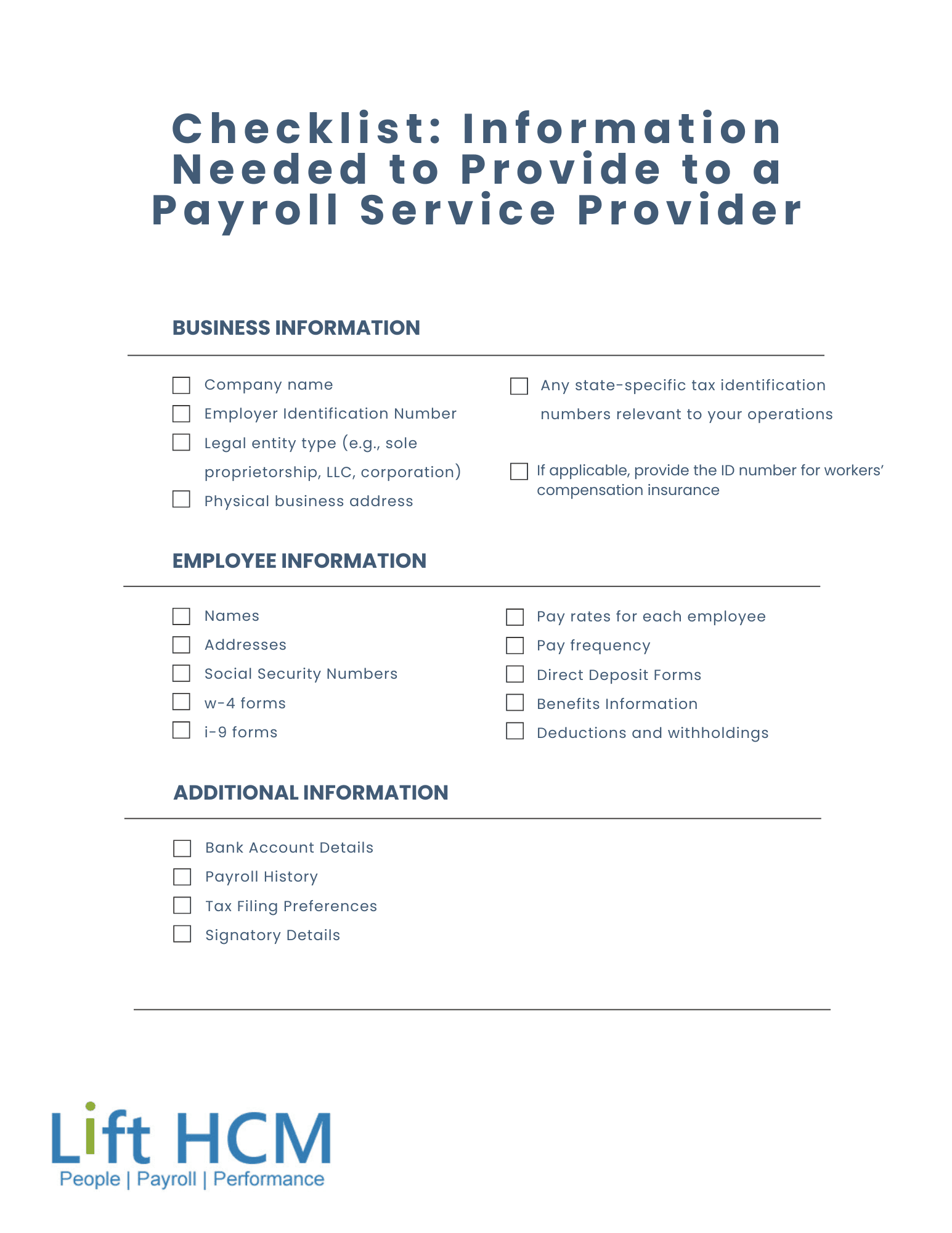 - Historical Payroll Data: Recent pay periods to ensure smooth transitions
