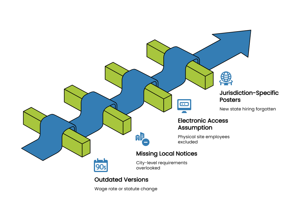 Even well-run HR departments make poster compliance errors. The most frequent issues we see include: