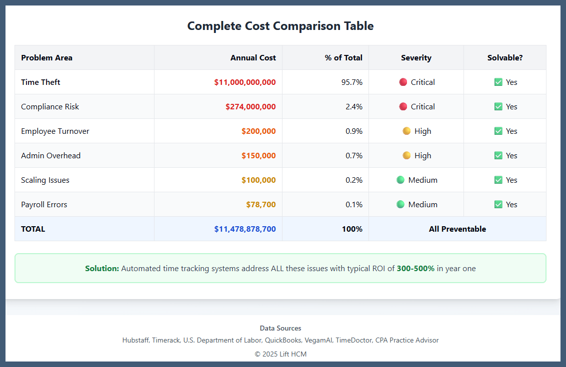 How much is manual time tracking really costing your business? The answer might shock you. Here are the three biggest drains on your bottom line—backed by industry research and real data from thousands of companies: