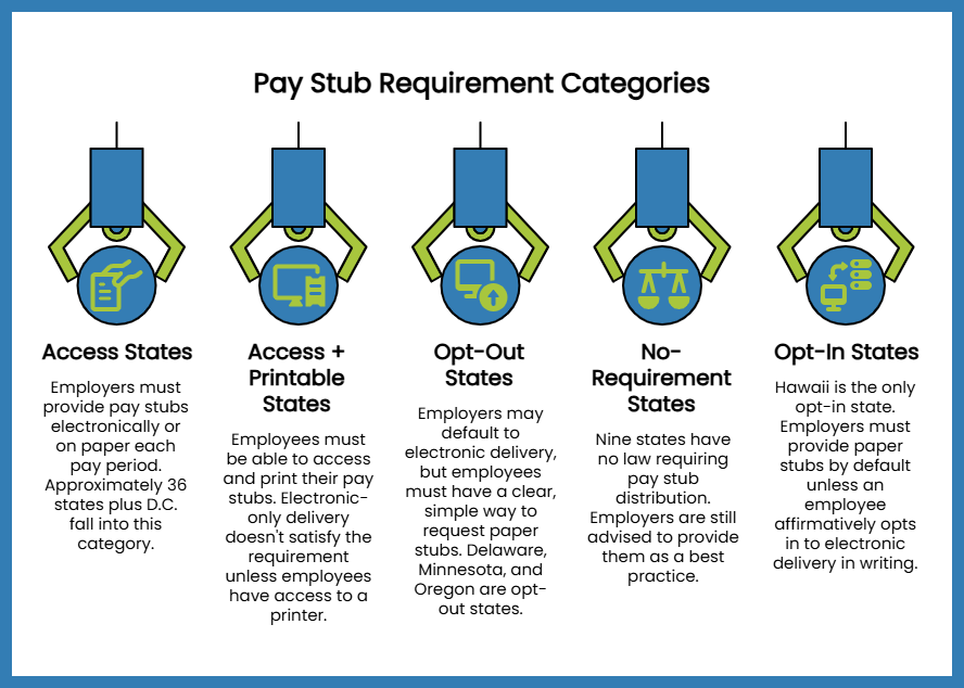 Before diving into state-by-state details, it's important to understand the five categories that describe how states regulate pay stub access and delivery: