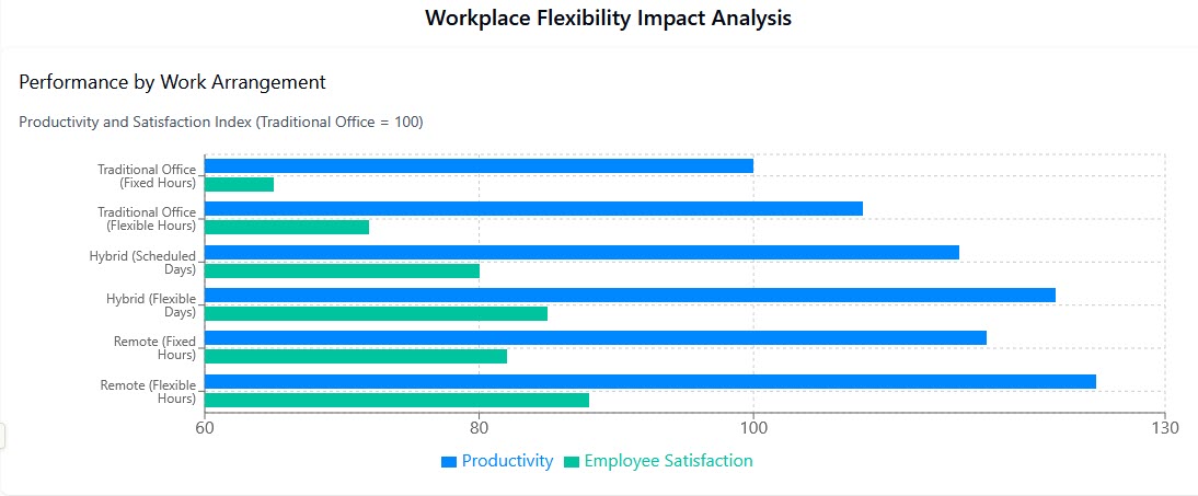 This bar chart compares productivity and satisfaction across six work arrangements, highlighting that flexibility boosts both, with remote work and flexible hours performing best.